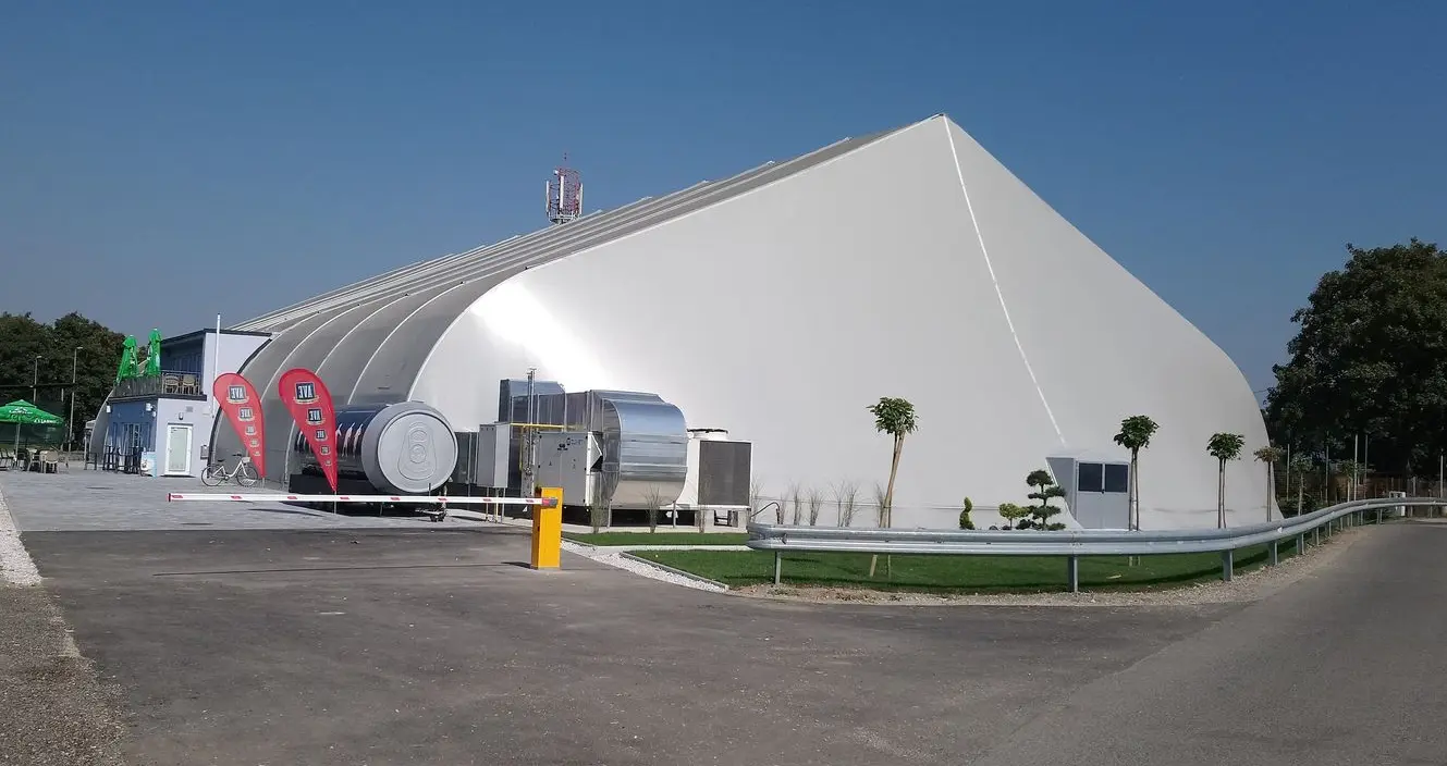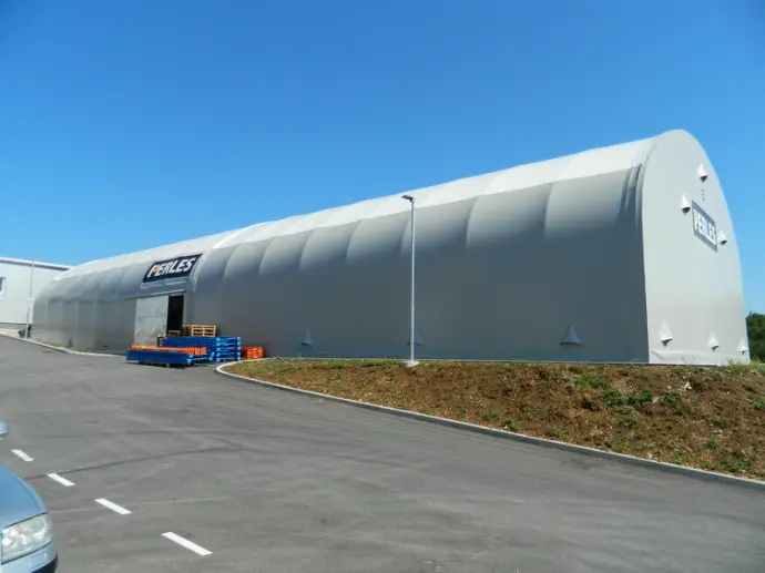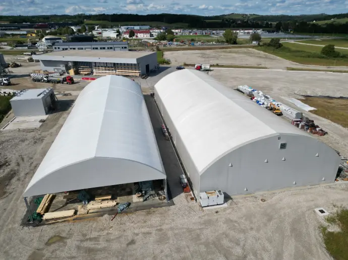 Prilagodljiv nadomestek klasične hale za hitro povečanje kapacitet – brez dolge gradnje in temeljev. Zasnova omogoča visoko svetlo višino, široke prehode za viličarje in TIR, ter enostavno povezavo z obstoječimi objekti.
